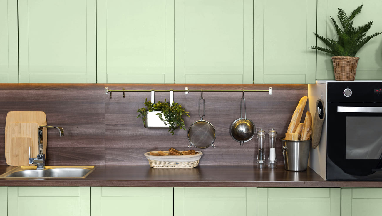 Фартук окрашен в тон, который отлично гармонирует с цветом фасадов гарнитура. Фото: freepik.com
