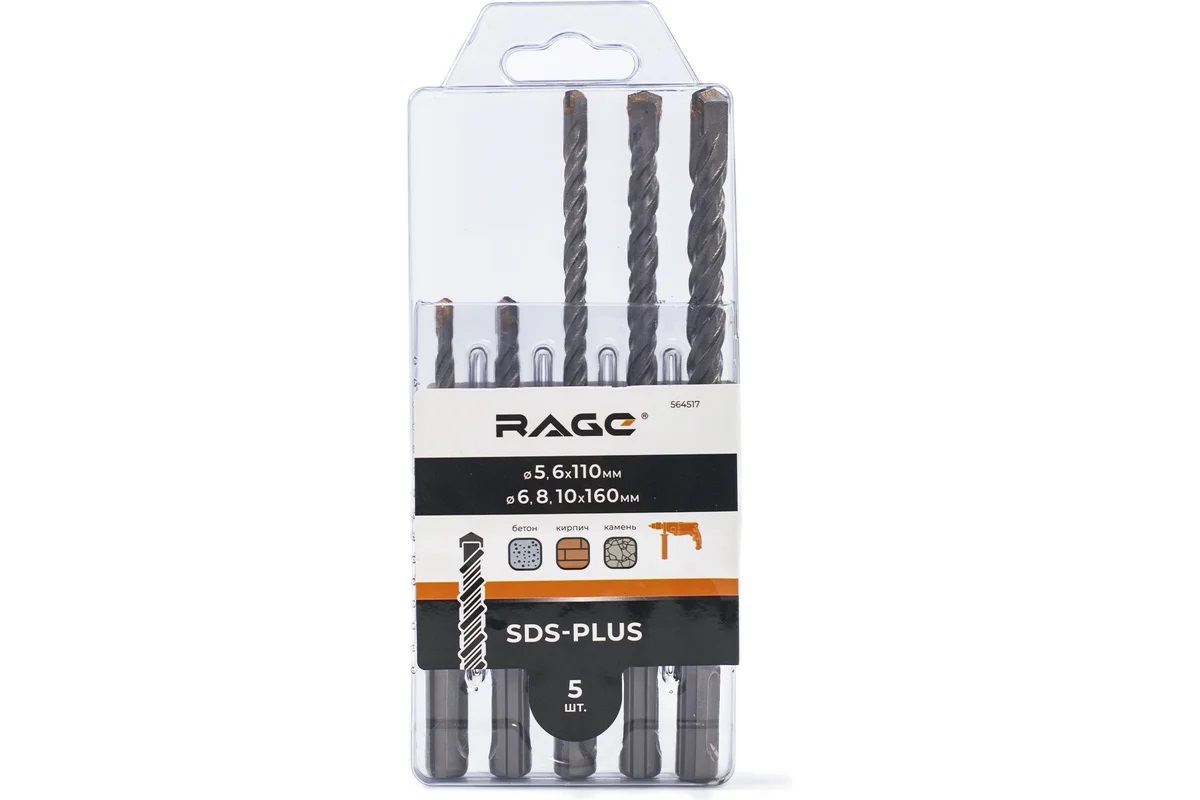 Набор буров по бетону 5,6х110; 6,8,10х160мм SDS-plus арт.564517 VIRA RAGE *1/12