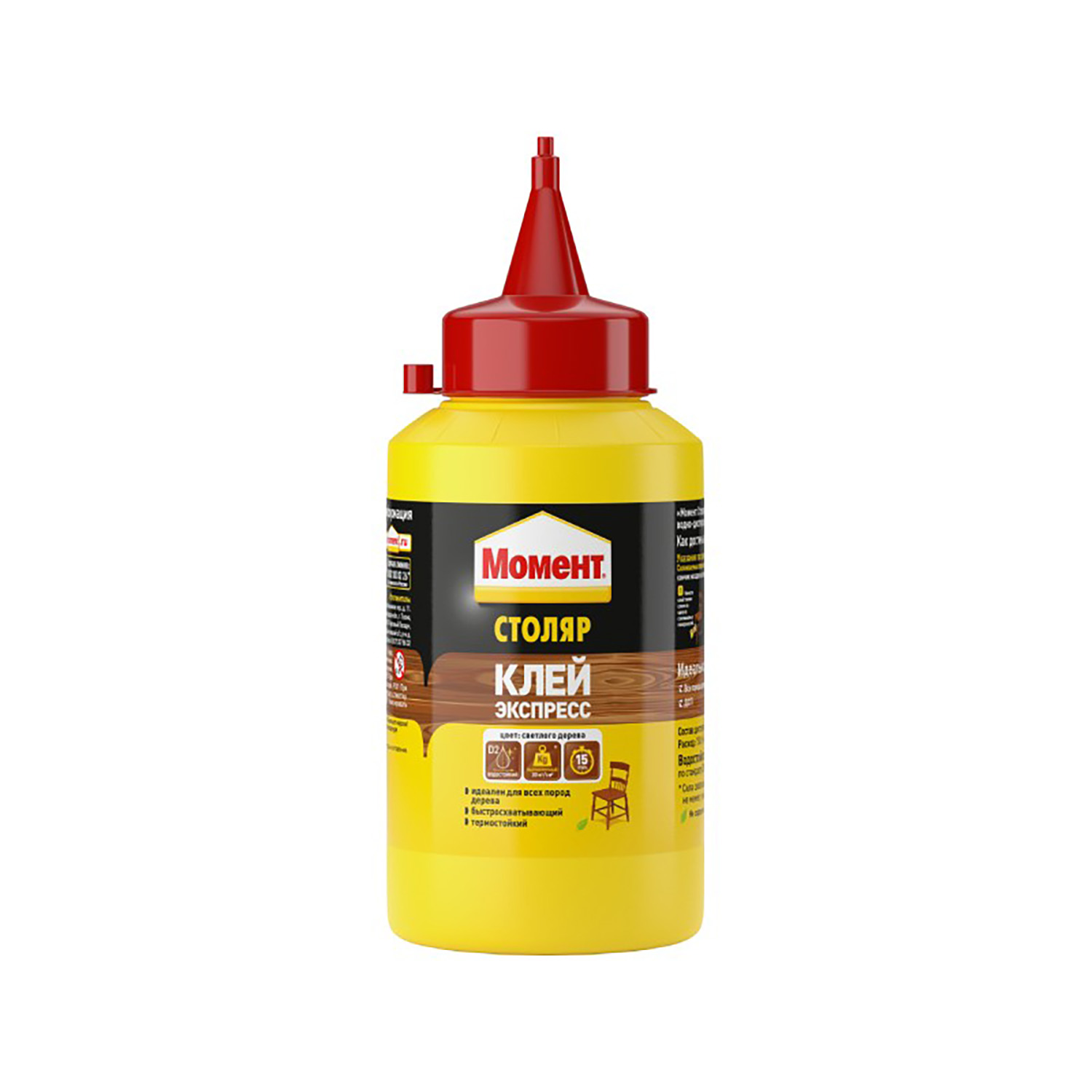 Клей Столяр Момент предназначен для различных пород дерева. С его помощью склеивают ДСП, фанеру, шпон, ламинат, картон, фурнитуру, ткань, кожу, некоторые пластики. Шов получается высокопрочный и устойчивый к кратковременному воздействию воды (водостойкость D2).