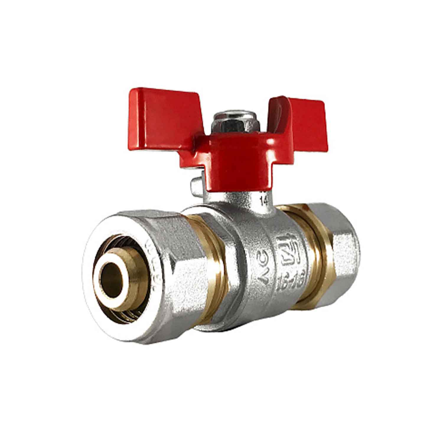 Кран шаровой для воды 16х1/2" CTM СТАНДАРТ с внутренней резьбой и цангой (обжимным соединением), ручкой-бабочкой. Особенности конструкции, технологии изготовления, применяемых материалов обеспечивают долголетнюю работу шарового крана СТМ СТАНДАРТ при эксплуатации в условиях отечественных инженерных систем. Корпус и шток крана изготовлен из высококачественной горячепрессованной латуни с никелированным покрытием. Шаровой затвор изготовлен из высококачественной горячепрессованной латуни, отполирован и покрыт хромом. В обжимном соединении используются уплотнительные кольца из резины EPDM, диэлектрическая прокладка из тефлона с добавкой углерода и термоприсадок на основе кремния , обжимное кольцо из латуни.