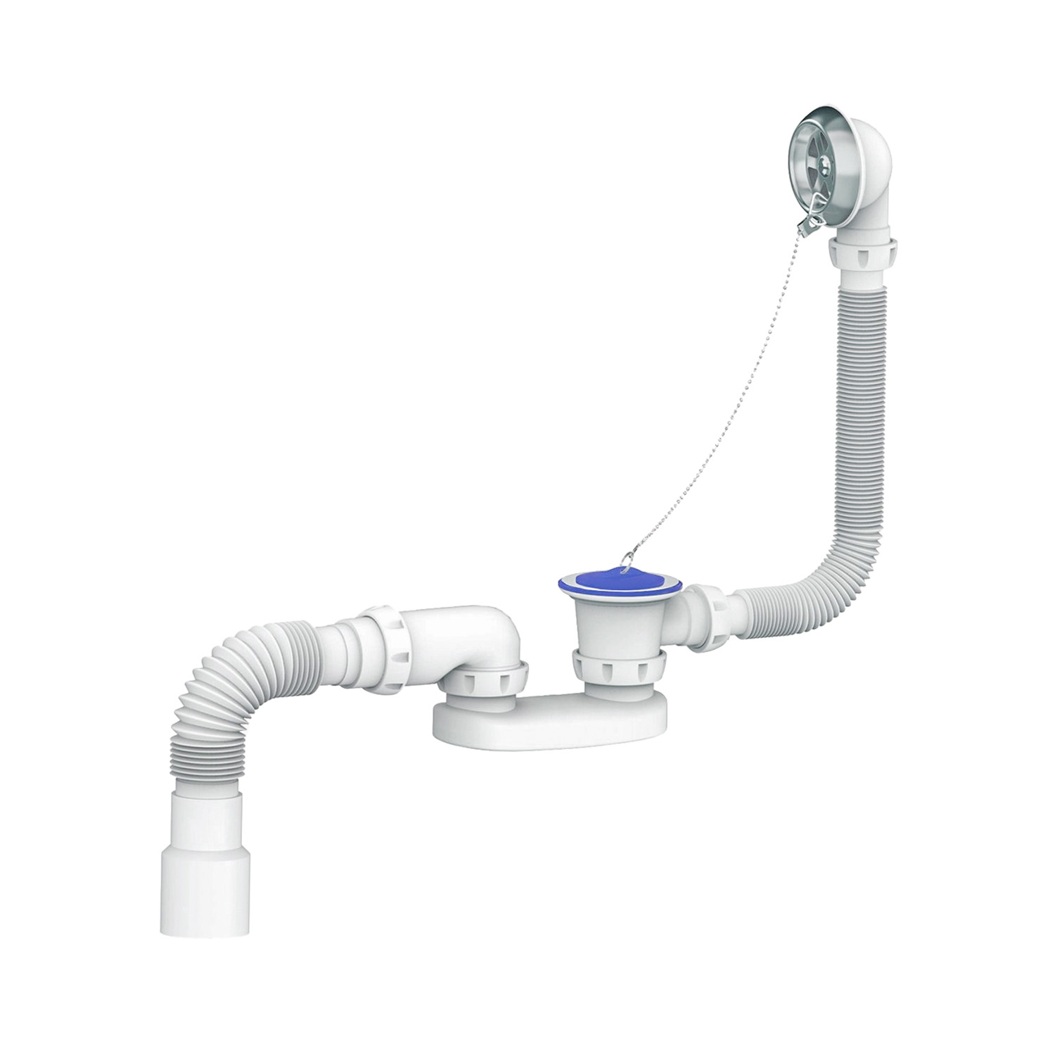 Сифон для ванны и глубокого поддона, перелив, винты 6х40, чашки из нержавеющей стали, пробка, цепочка, гибкий отвод в канализацию Ø40хØ40/50 400 мм.