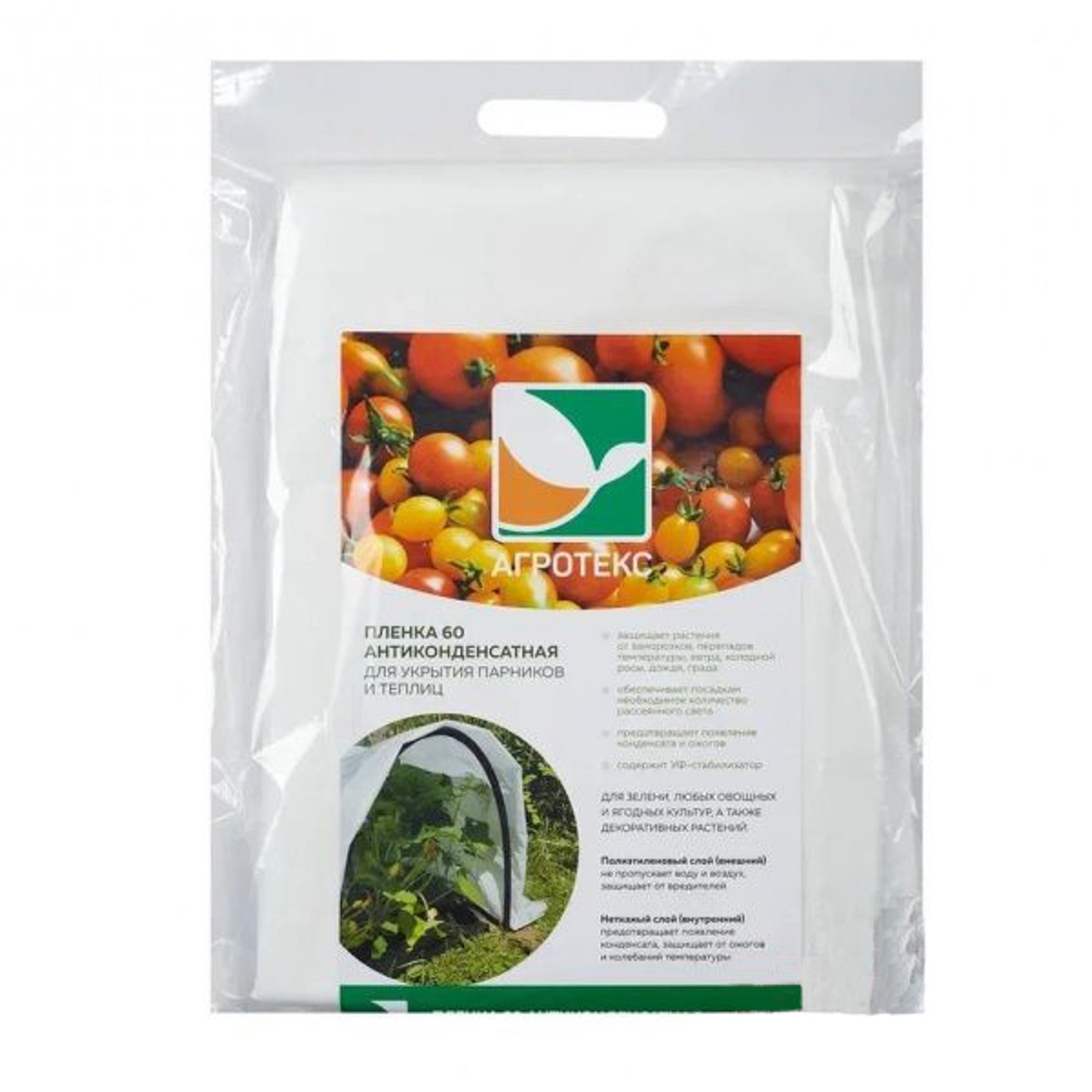 Полиэтиленовый слой (внешний) – не пропускает воду и воздух, защищает от вредителей. Нетканый слой (внутренний) – предотвращает появление конденсата, защищает от ожогов и колебаний температуры.