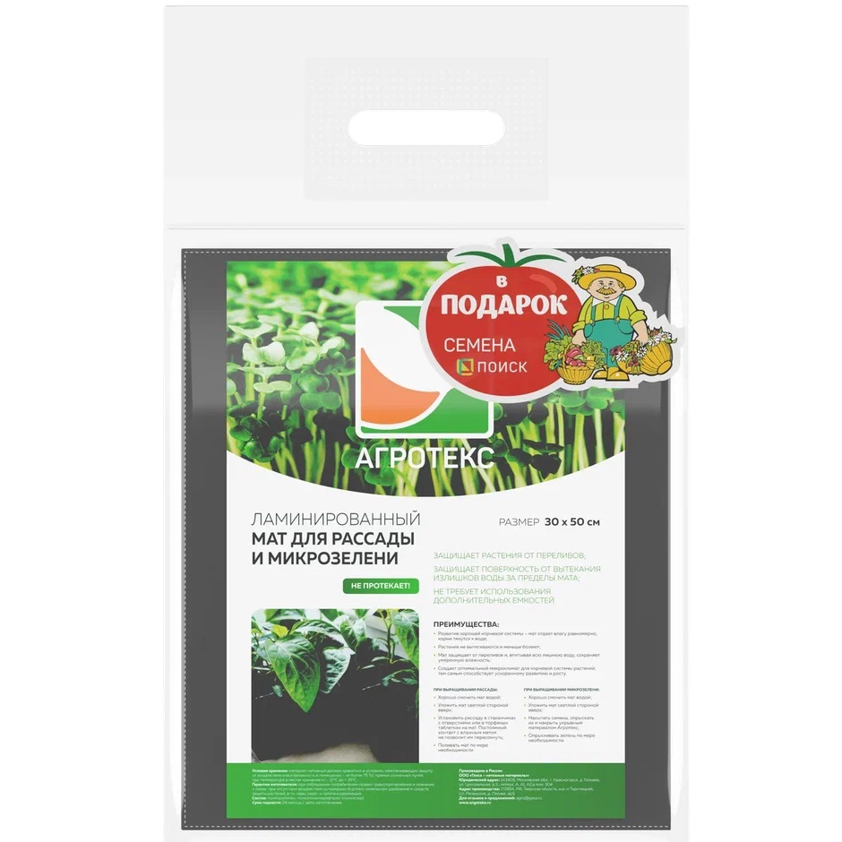Мат для рассады и микрозелени Агротекс 30х50 см изготовлен из комбинированных нетканых материалов и имеет три слоя: черный ламинированный нижний, белый верхний и внутренний впитывающий. Мат впитывает и равномерно распределяет по поверхности воду, затем постепенно отдает ее, насыщая растения влагой и исключая застой жидкости у корней. Растения защищены от пeреливов, а у корневой системы сохраняется оптимальный микроклимат. Материал не протекает и не требует использования дополнительных емкостей (поддонов, подносов).
