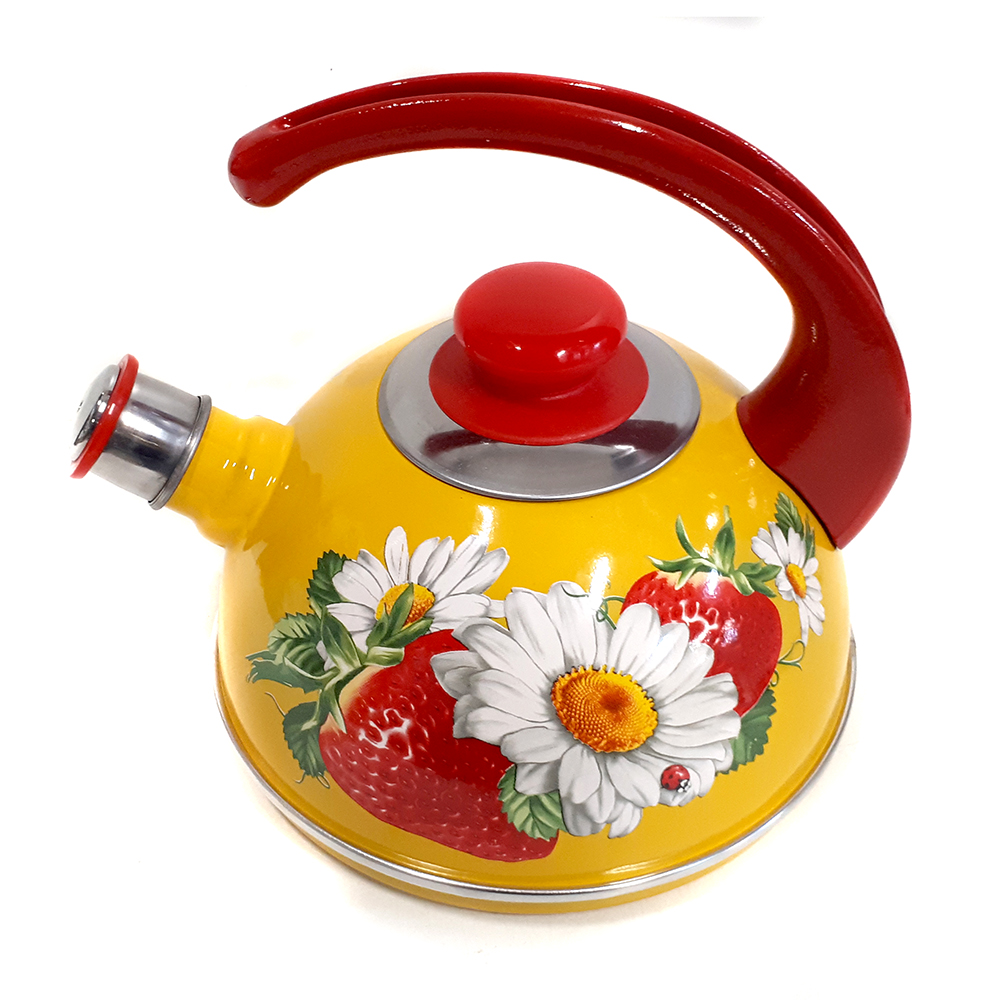 яяяЧайник эмалированный со свистком 2,5л декор "Клубника с ромашкой" Желтый T04/25/16/05/H13 *1/4